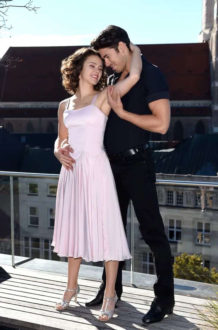 She’s wearing the signature soft pink swing dress and heels, while he keeps it simple and sexy in black on black. It’s flirty, nostalgic, and perfect if you plan to steal the spotlight on the dance floor.