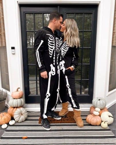 Matching skeleton onesies? Now that’s love. This look is equal parts cozy and cute, perfect if you’re more into handing out candy and sipping cider than hitting the club.