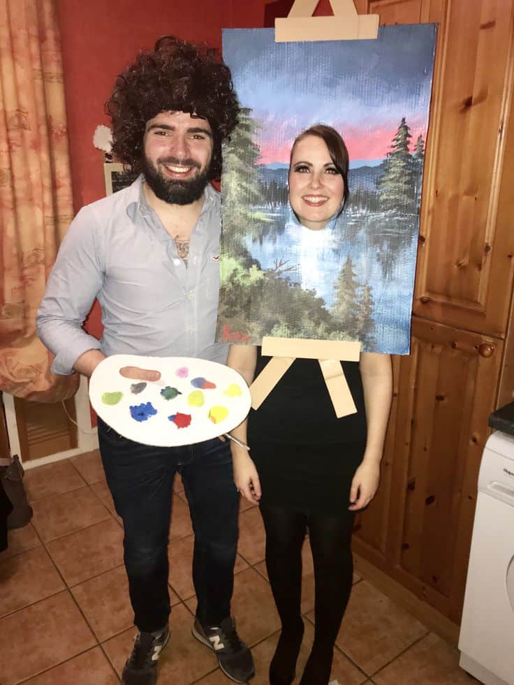 Talk about a creative twist! This costume idea brings an artsy sense of humor to Halloween night. He’s rocking the full Bob Ross look, curly wig, palette, and all, while she’s cleverly dressed as the literal painting,