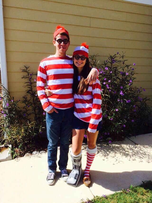 The matching beanies, round glasses, and striped tops make this an easy last minute costume idea that still looks adorable together. Plus, you’ll definitely get bonus points if you “hide” in party photos for people to find. Fun, nostalgic, and totally on theme.