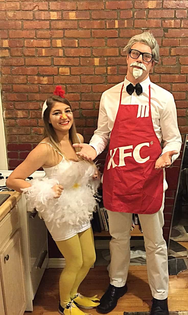 He’s serving up the full KFC look with a white suit, red apron, and fake mustache, while she clucks it up in a fluffy feathered dress and yellow tights. It’s funny, clever, and guaranteed to get people talking and maybe a little hungry.