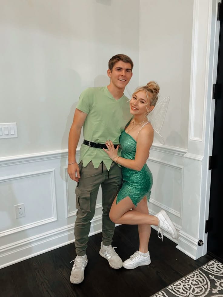 This playful costume brings a touch of Neverland magic to your Halloween plans. He’s rocking a green shirt with jagged edges and cargo pants for a casual Peter Pan vibe, while she sparkles in a green glitter dress with delicate fairy wings and white sneakers for a comfy twist.