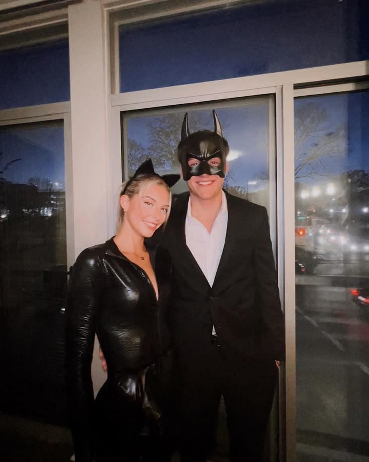 Here’s a dynamic duo with serious edge. He’s suited up as Batman with a mask and tailored black suit, while she’s bringing all the sleek energy in a figure hugging black catsuit and cat ears.