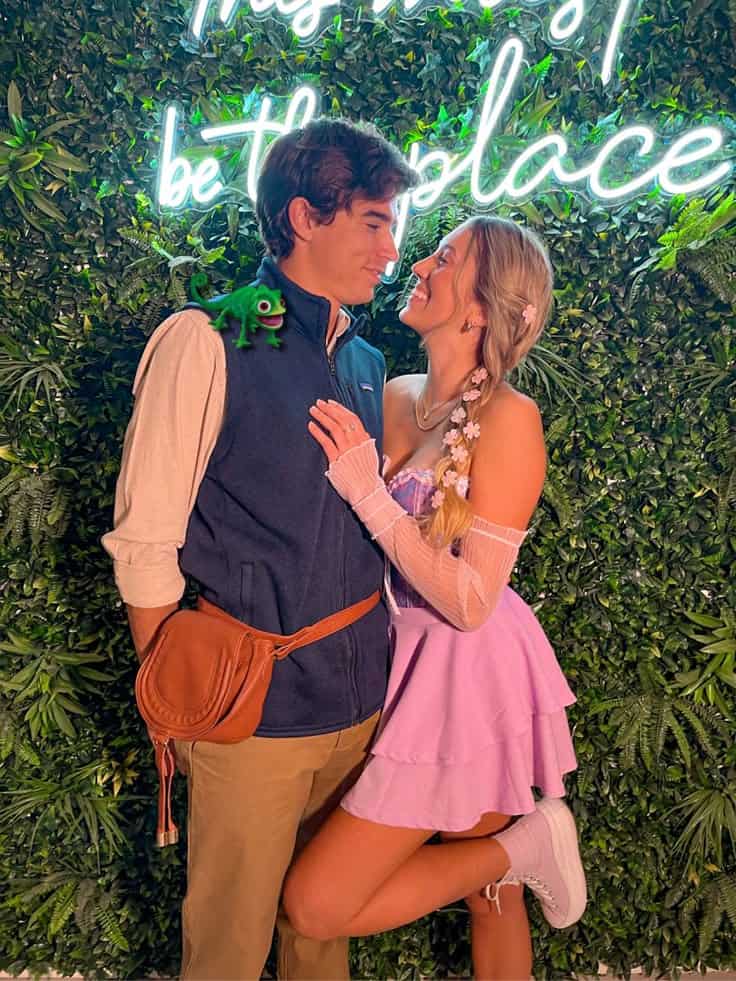 This Tangled inspired look is sweet, playful, and seriously photogenic. Her lilac dress, long braid (complete with flowers!), and his satchel and vest totally nail the fairytale vibe, without needing a full Disney production budget.