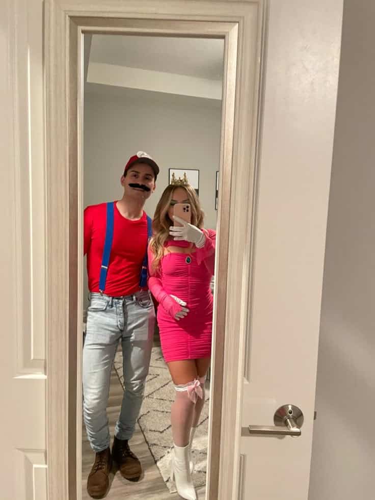 He’s sporting Mario’s signature red shirt, denim suspenders, and mustache, while she goes full royal with a pink bodycon dress, crown, and gloves as Princess Peach. It’s fun, flirty, and instantly recognizable just try not to shout “It’s-a me!” all night long (or do, no judgment).