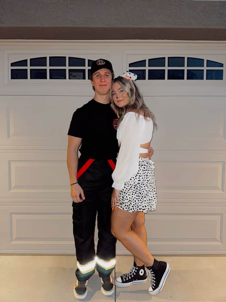 This one’s giving major rescue me vibes in the cutest way possible. He’s suited up in full firefighter mode while she pulls off the perfect spotted Dalmatian look, complete with ears and freckles.