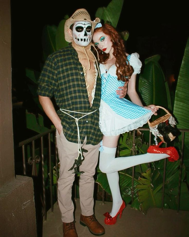 Dorothy is in her signature blue gingham dress with sparkly red heels, while the scarecrow partner has gone full haunted farm with face paint, a straw hat, and some stitched up details. It’s a great mix of cute and creepy that totally works for Halloween night.