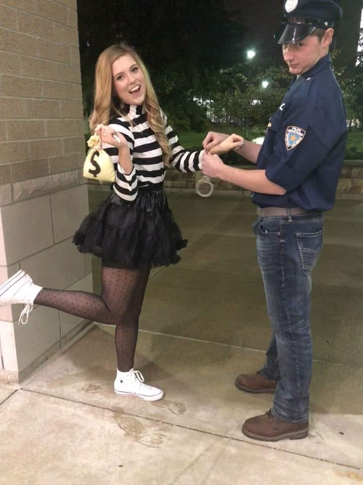 She’s all smiles in a striped top, tutu, and polka-dot tights while cheekily clutching her money bag, and he’s bringing the serious cop energy in full uniform (complete with handcuffs). It’s playful, bold, and ideal if you’re looking for a duo costume that’s easy to throw together but still makes a statement.