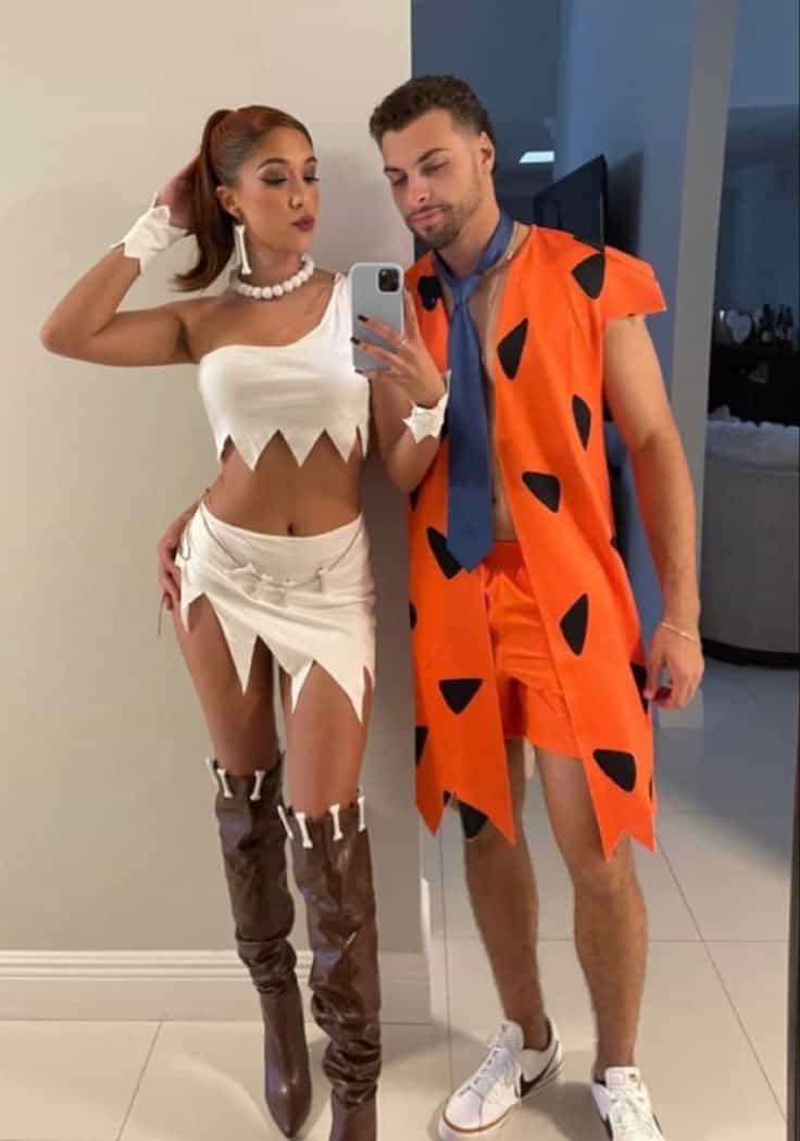 He’s rocking Fred’s classic orange tunic and blue tie, while she stuns as Wilma in her white one shoulder dress and chunky necklace. It’s charming, nostalgic, and a total crowd pleaser if you’re going for that vintage cartoon energy.