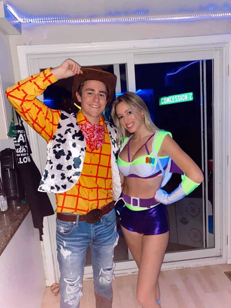 Woody and Buzz LightyearThis take on the classic Toy Story duo is giving playful, bold, and just the right amount of nostalgic. He’s channeling Sheriff Woody with his plaid shirt, cowboy hat, and boots, while she brings the sass as a glammed up Buzz Lightyear in neon accents and space ranger flair.