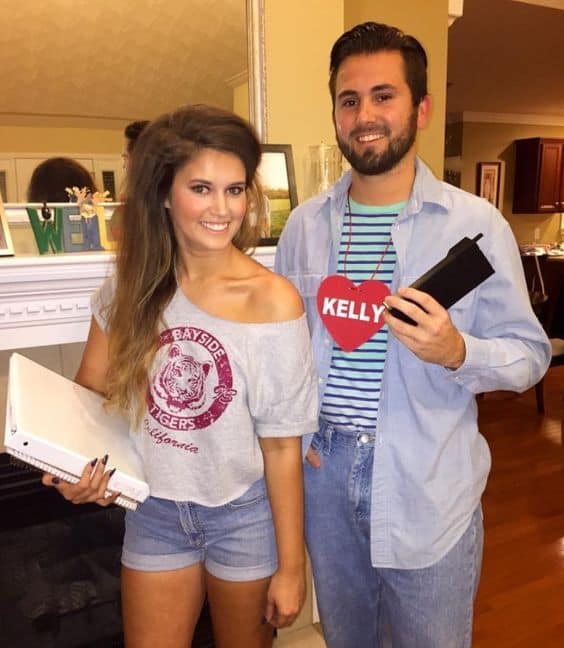 She’s channeling Kelly Kapowski with big hair, a tucked tee repping Bayside High, and classic denim shorts. It’s effortlessly cool, super recognizable, and the perfect couple’s costume for anyone who grew up dreaming of hanging at The Max.