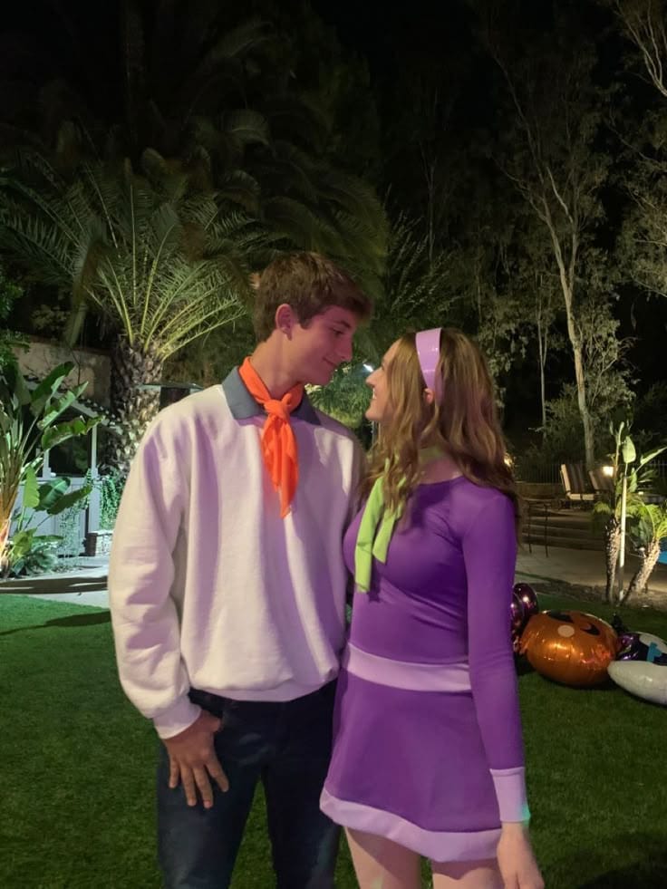 Fred’s signature white sweater and orange neckerchief pairs perfectly with Daphne’s purple mini dress and matching headband. It’s playful, nostalgic, and perfect for any duo who grew up solving cartoon mysteries on Saturday mornings.