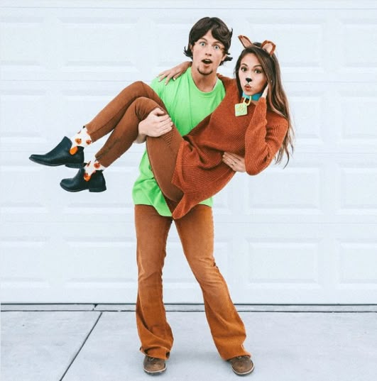 These costumes are a total throwback for anyone who grew up watching the Mystery Inc. gang. He’s dressed as Shaggy in his signature green shirt and brown pants, while she pulls off the cutest version of Scooby-Doo in a cozy rust sweater, matching pants, and fun dog ears.