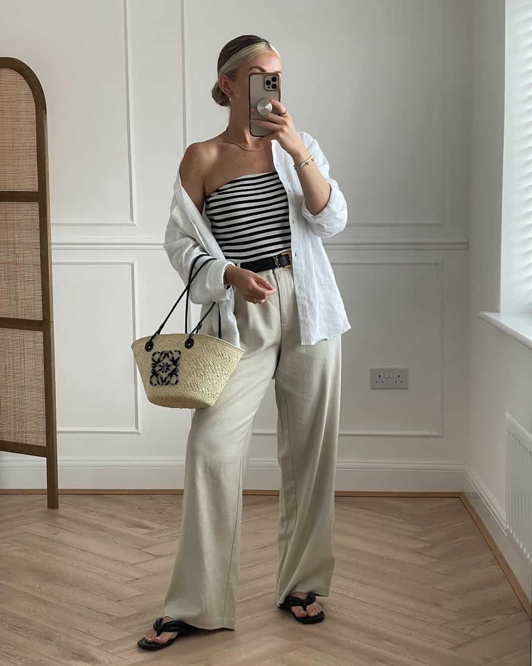 Who says laid back can’t be seriously cute? This look is giving “just grabbed a croissant and I’m headed to the market.” The striped bandeau top adds a pinch of Parisian flair, while wide leg trousers and a breezy white button down keep things cool.