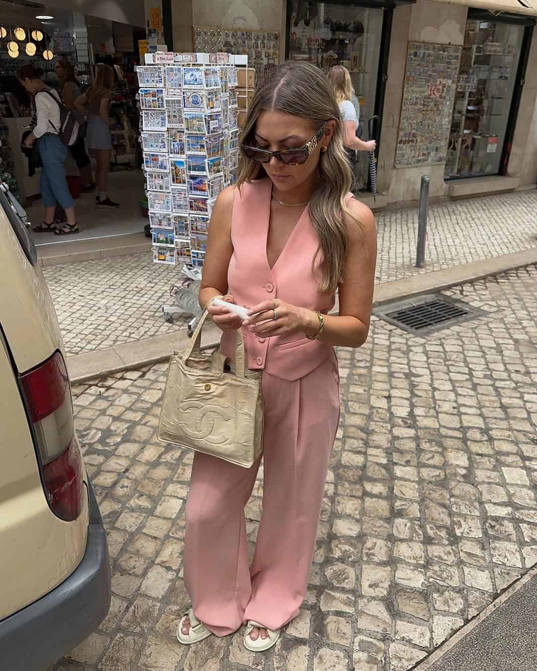 RECREATE THIS LOOK: Pink Trousers | Pink Waistcoat | Cream Sandals | Cream Canvas Tote