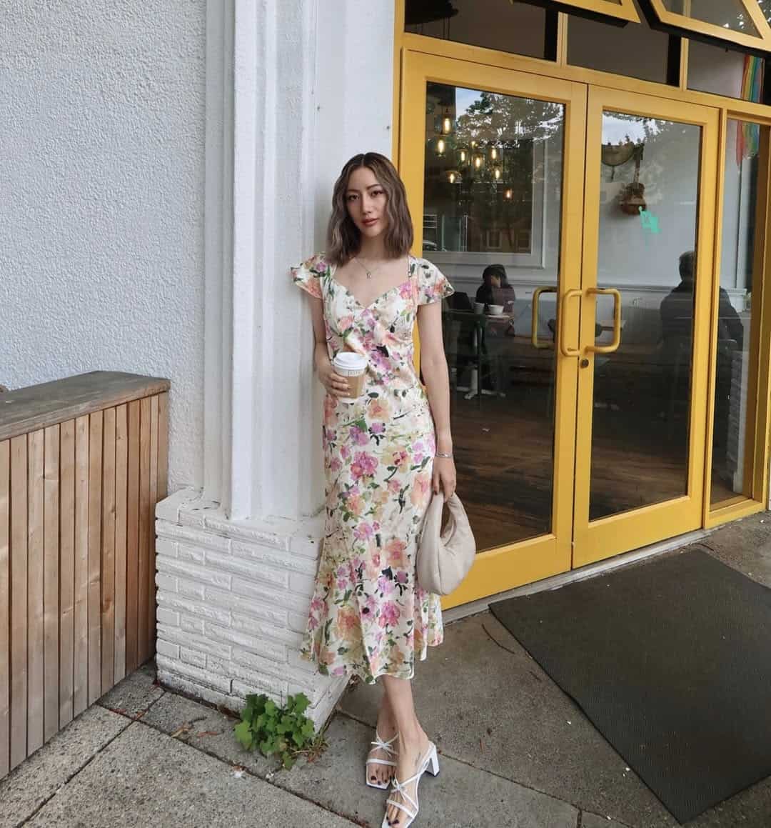 RECREATE THIS LOOK: Floral Midi Dress | Strappy Slip On Sandals | Beige Hand Bag