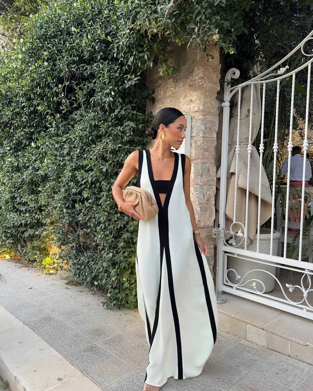 Talk about a showstopper. This sleeveless white maxi dress trimmed with black piping is giving all the crisp, cool energy of a Mediterranean breeze.