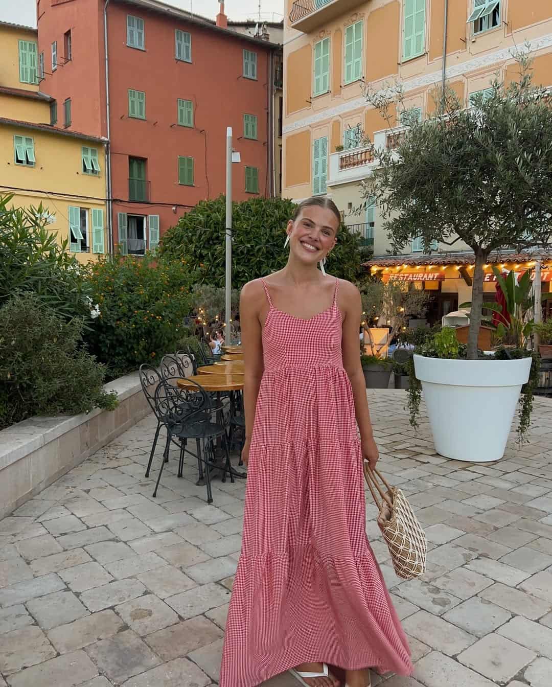 This pink gingham maxi is giving full on sunshine in dress form. With its sweet spaghetti straps and tiered skirt, it’s basically made for twirling down cobblestone streets with gelato in one hand and no plans in the other.