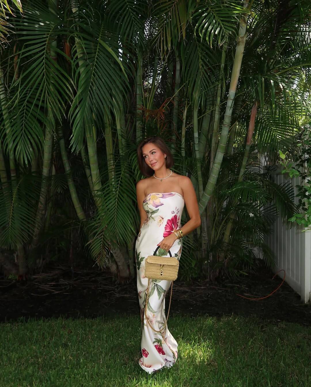 RECREATE THIS LOOK: Strapless Floral Maxi Dress | Woven Hand Bag