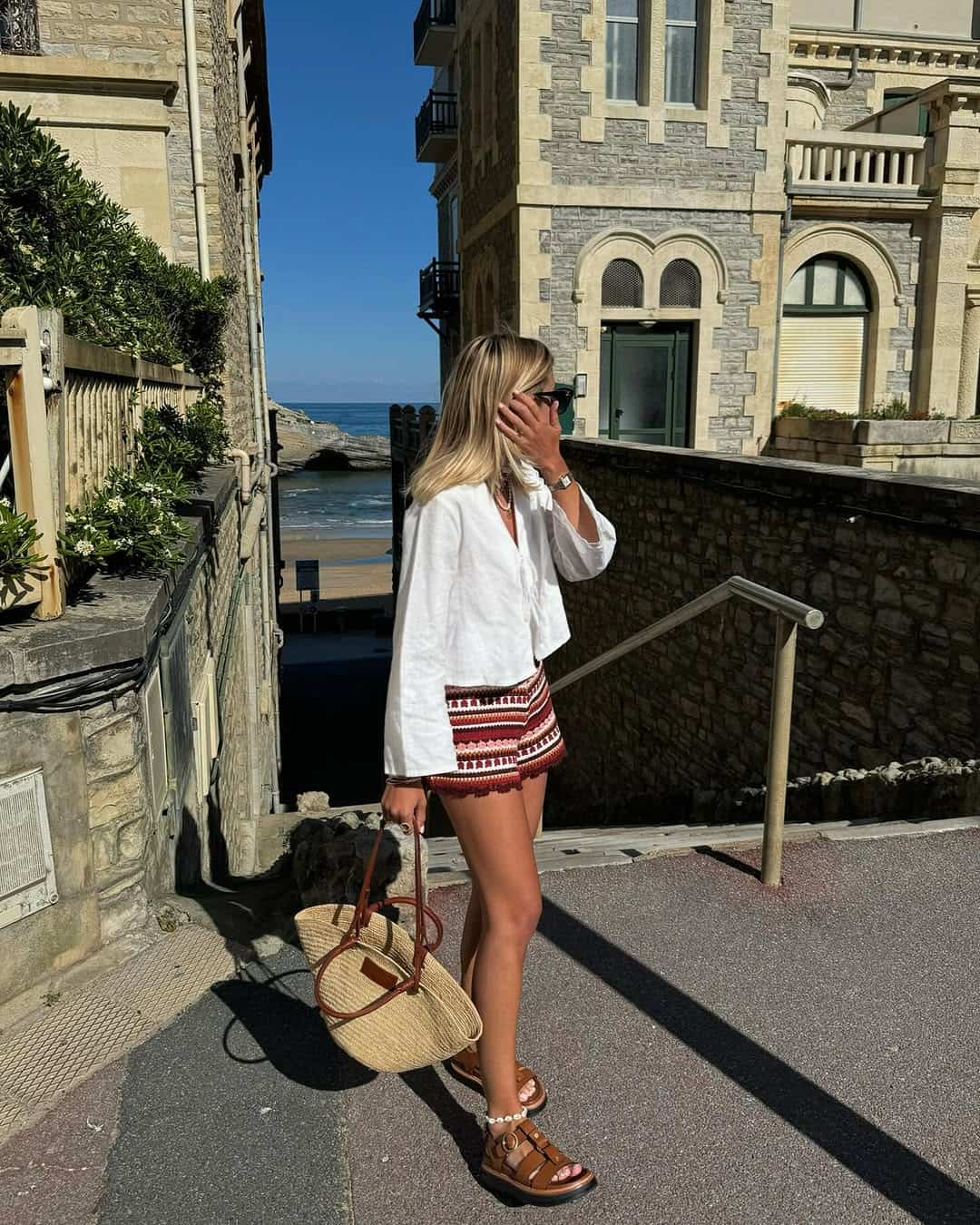 A crisp white shirt pairs perfectly with detailed woven shorts, while brown leather sandals and a straw tote make it ideal for exploring beach towns like Biarritz.