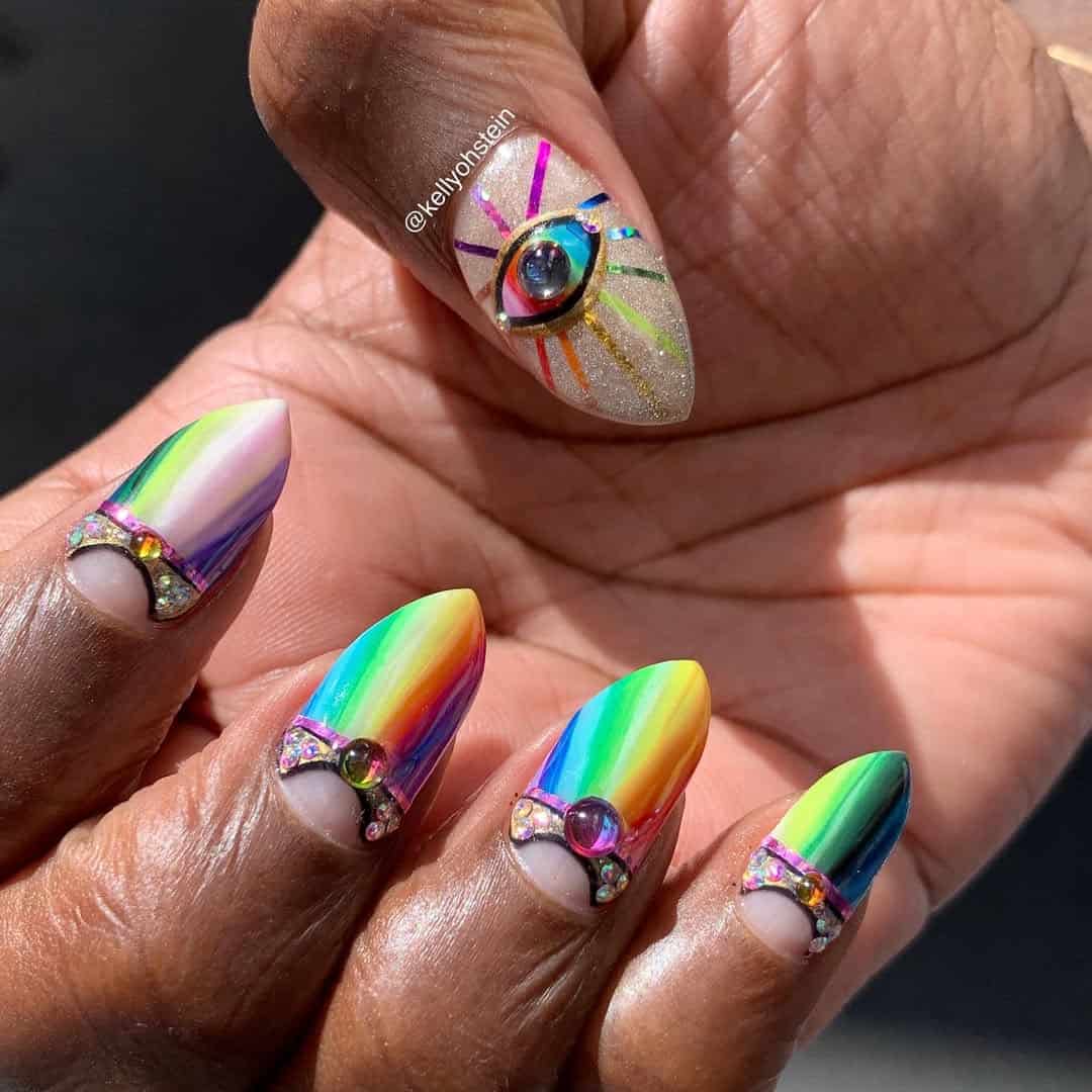 These rainbow chrome nails are a full on celebration. Each tip glows with a gradient of neon hues, anchored by gem lined cuticles and one dazzling third eye accent nail that’s part glitter, part holographic masterpiece.