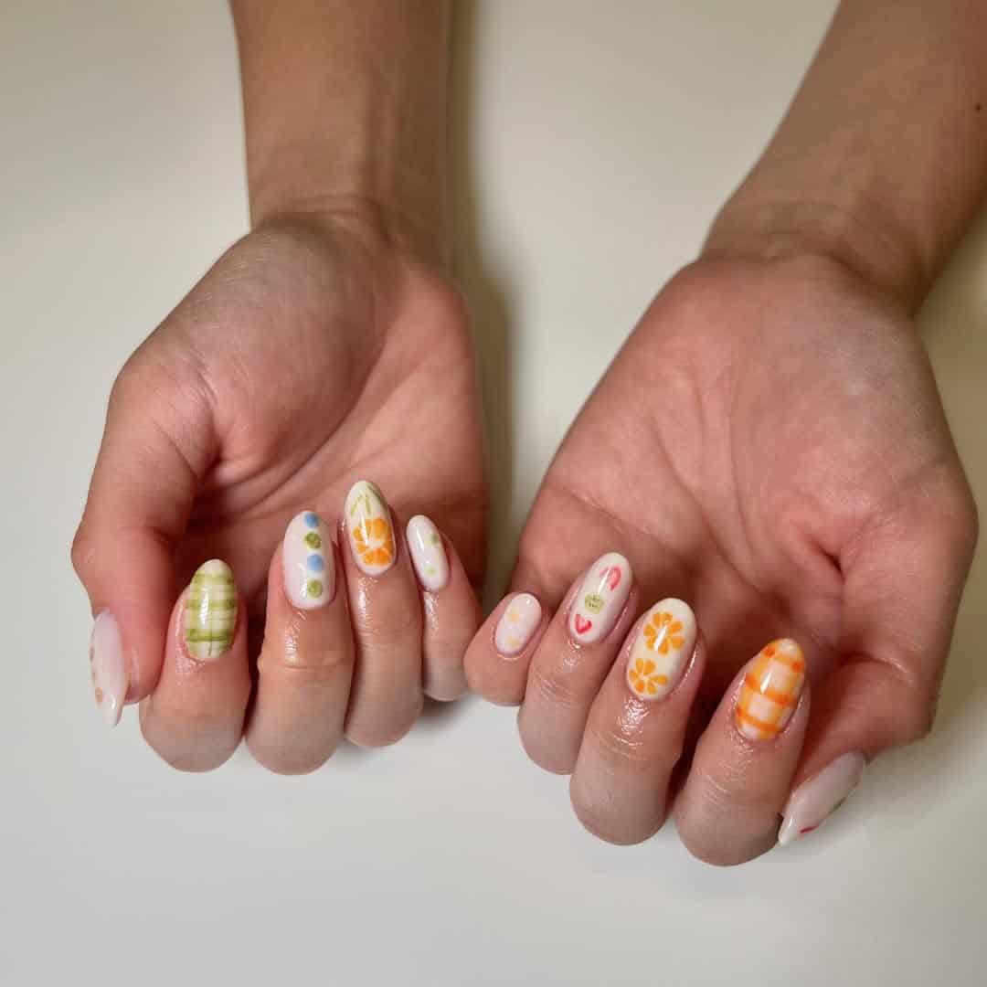 This design is a total summer scrapbook for your fingertips. Think daisies, hearts, polka dots, and bright gingham, all hand painted on a creamy base that lets each playful detail pop.