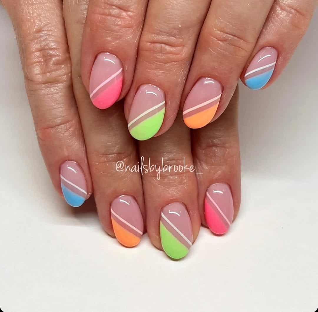 Bright, breezy, and super wearable, this look is like summer sorbet in manicure form. Each nail features a clean diagonal dip of pastel pink, green, orange, and blue, paired with a glossy nude base for balance.