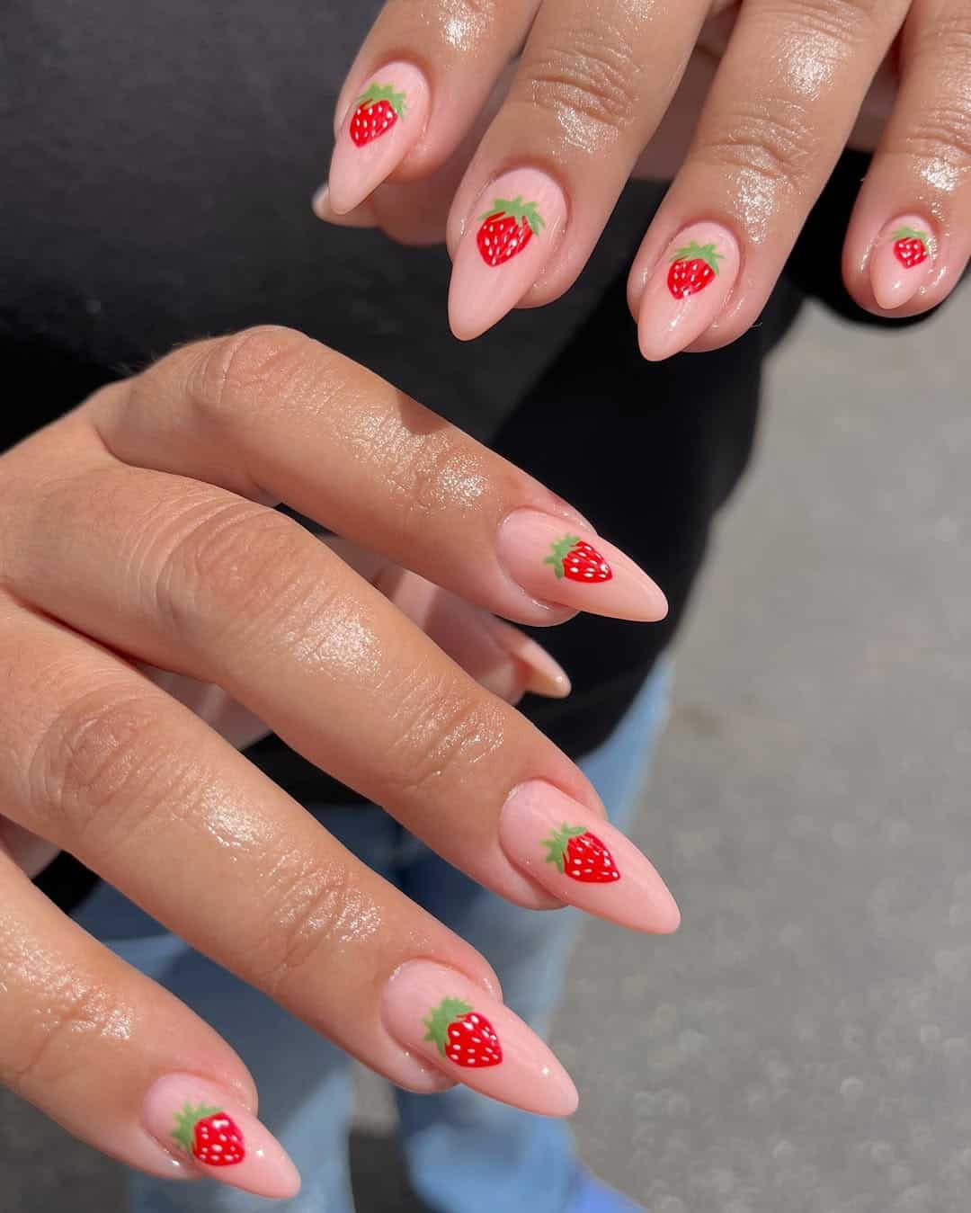 These strawberry topped nails are almost too cute to handle. Set on a creamy pink base, each little berry is hand painted perfection!