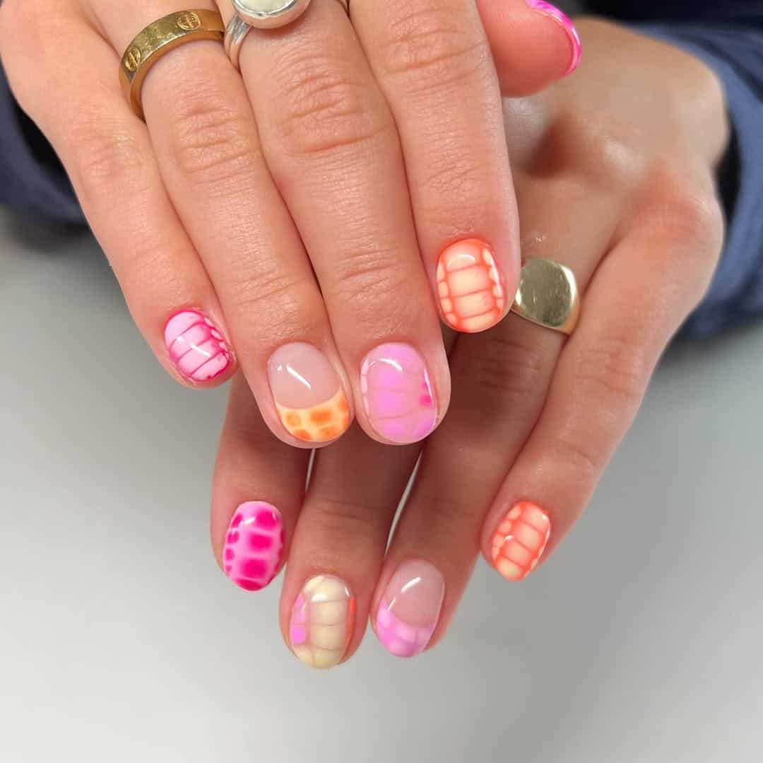 Meet the manicure that’s basically a party for your fingertips. This bold and punchy design mixes hot pink, coral, and orange tones with a translucent grid effect that gives serious 90s summer energy. It’s fun, funky, and just chaotic enough in the best way.
