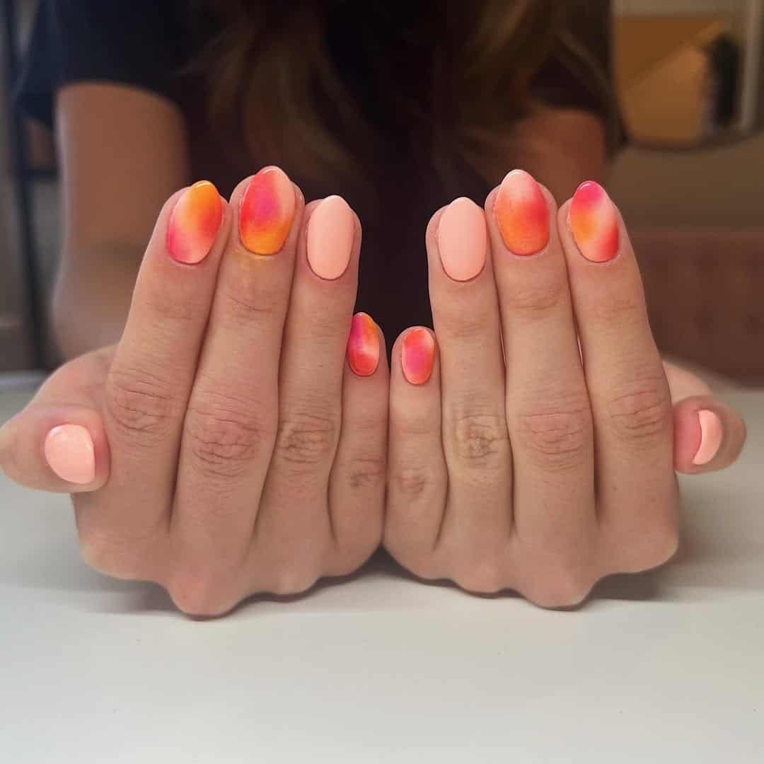This dreamy blend of peach, pink, and golden orange looks like the first light of day wrapped up in a mani. Some nails go all in on the ombré, while others keep it solid and sweet, giving you the best of both worlds.