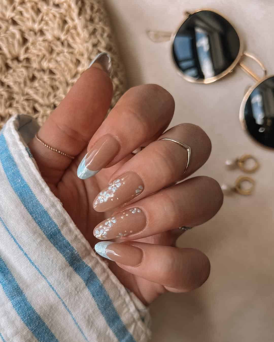 Soft, sheer, and subtly stunning, these nails brings dreamy sky vibes with delicate blue French tips and dainty floral accents.