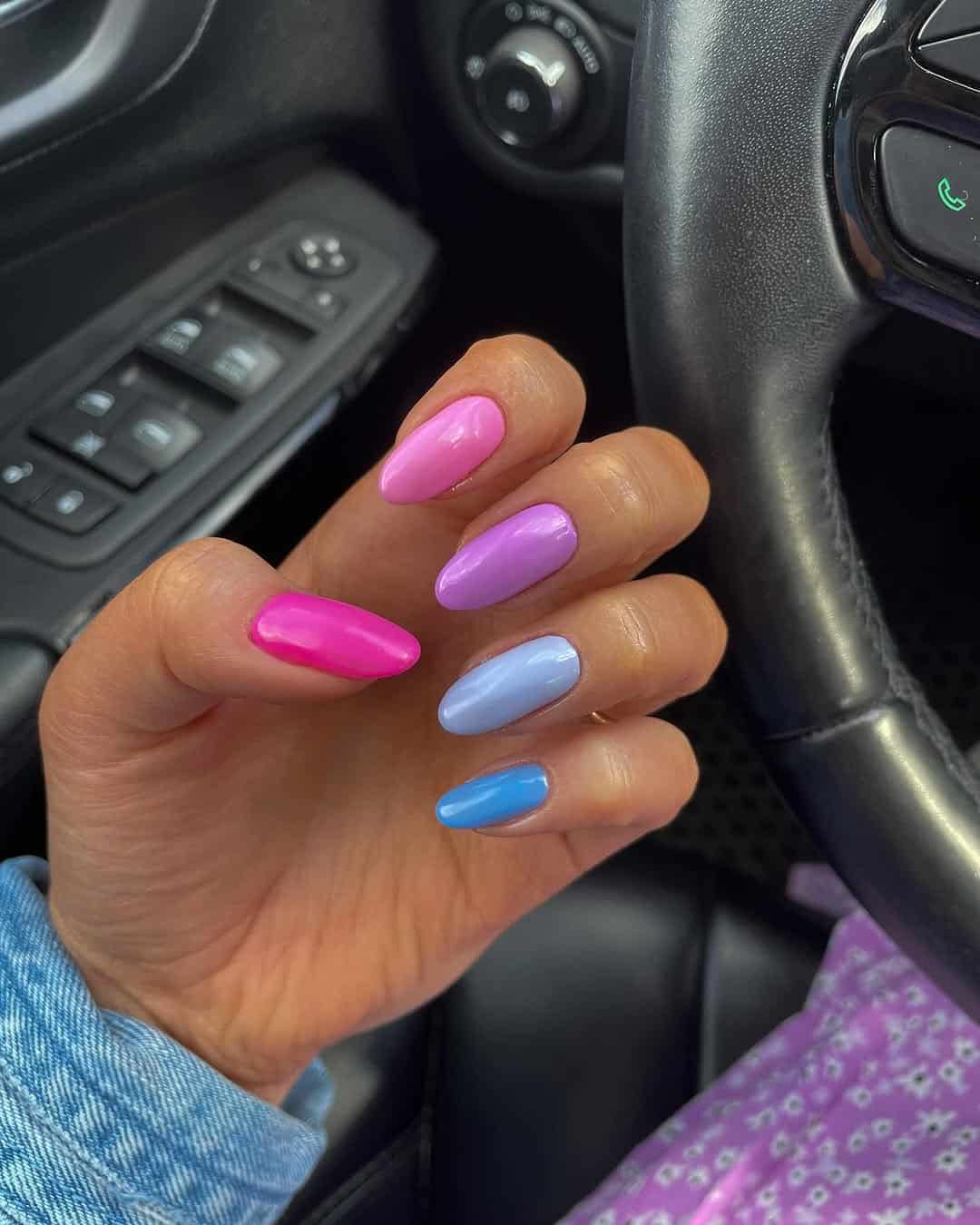 If June were a gradient, it’d look exactly like this mani. From vibrant pink to soft lilac and sky blue, each nail is like a scoop from a pastel candy shop. The glossy finish gives it that ultra smooth, fresh out of the salon shine, basically the nail equivalent of a good mood.