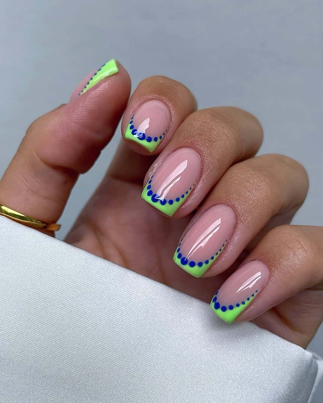 Fresh, punchy, and just a little retro, this mani brings the fun. Neon green French tips meet royal blue dot detailing for a playful twist that still feels clean and minimal.