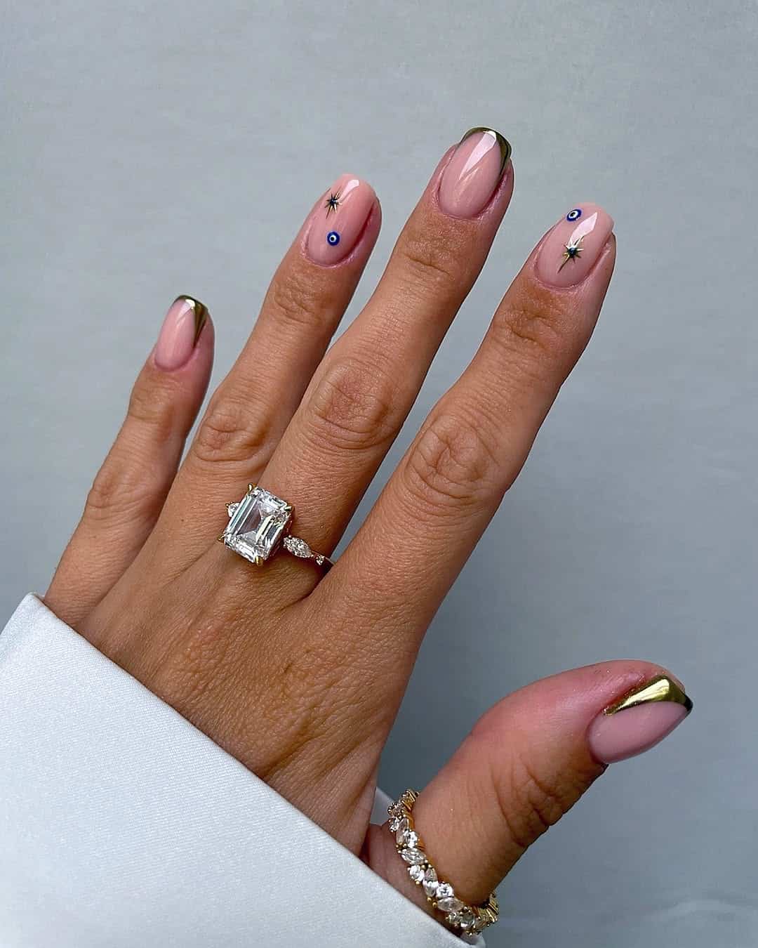 This one’s for the girls who love a soft glam moment. A classic nude pink base meets metallic gold French tips, finished with tiny evil eye and star details that feel just the right amount of mystical. It’s elegant with a playful twist, it’s like your favorite gold jewelry, but for your nails.