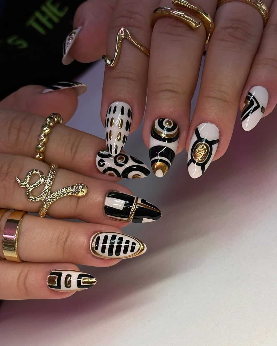 With graphic shapes, metallic touches, and intricate patterns, this almond shaped set is perfect for anyone looking to add an edgy, fashion forward statement to their May nail lineup.