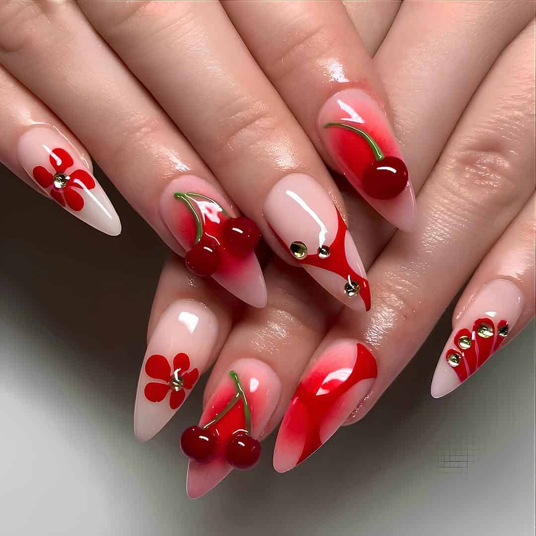 This distinct almond shaped design brings the heat with glossy red cherries, bold abstract swirls, and golden stud accents.
