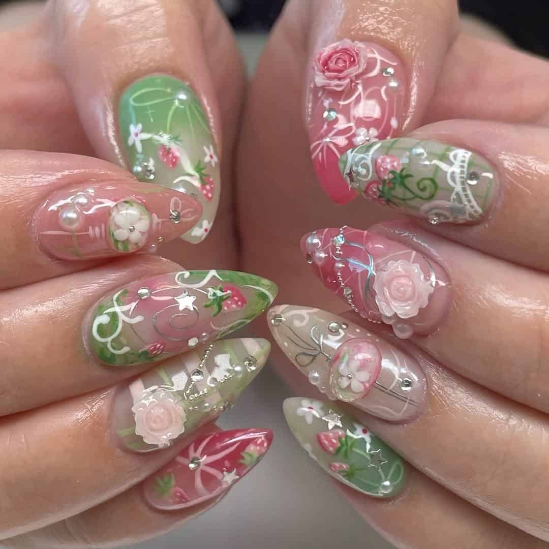 The soft pink and green tones paired with 3D roses create a whimsical look that’s ideal for anyone craving a sweet, storybook inspired manicure.