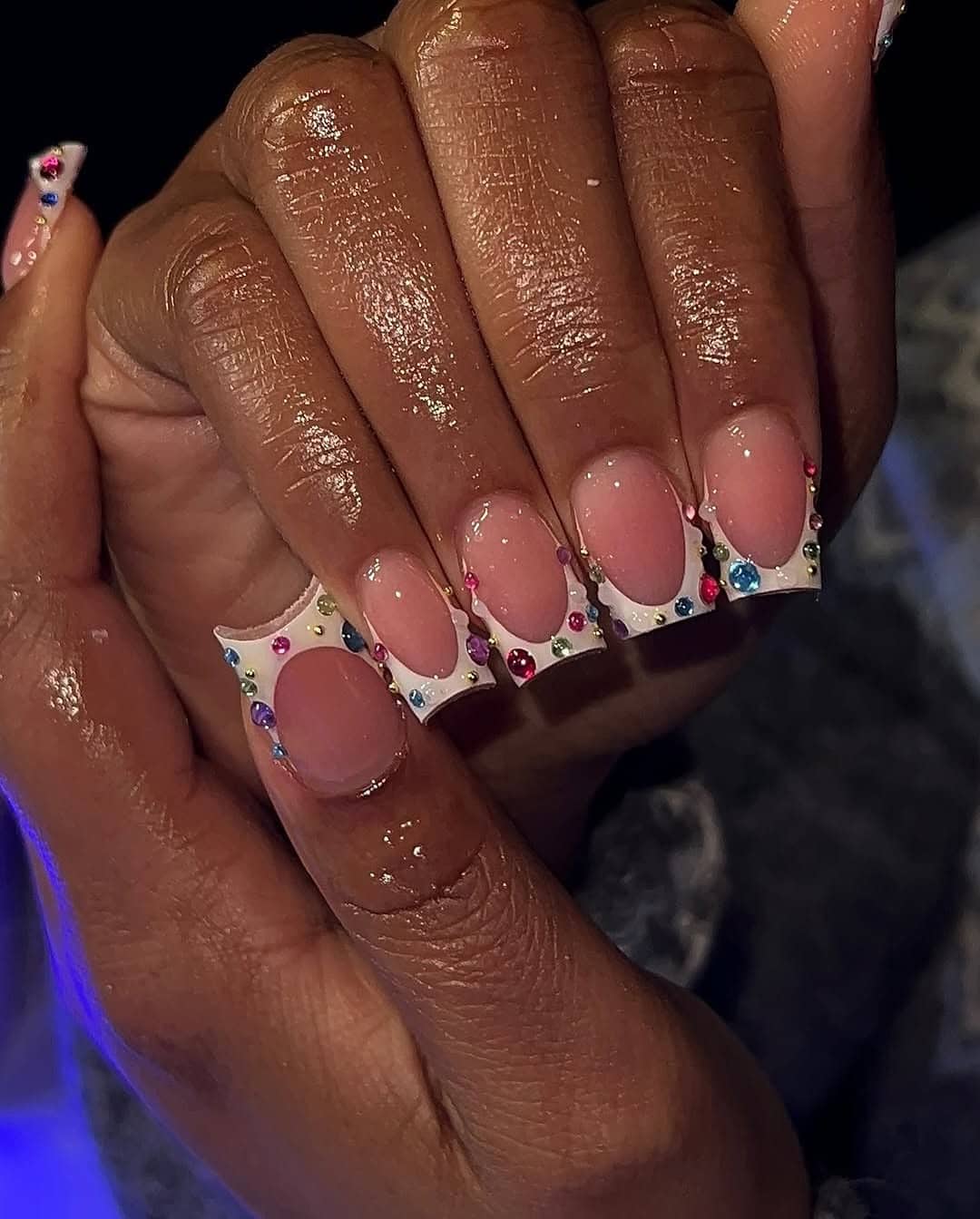 This square shaped set takes French tips to the next level with a white base loaded up with colorful rhinestones.