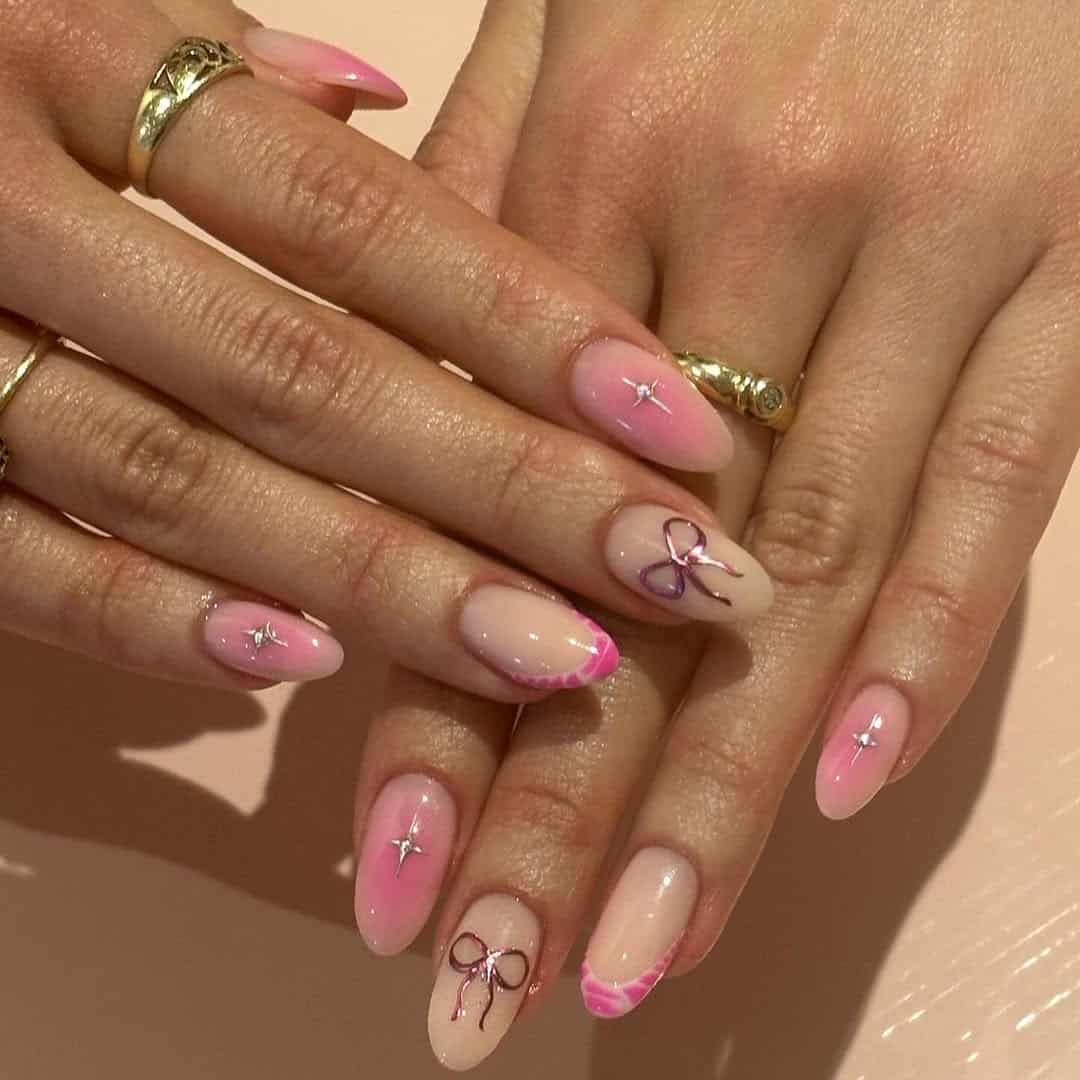 This sweet almond shaped set blends glossy pink gradients with adorable chrome bow decals and dainty star like sparkles.