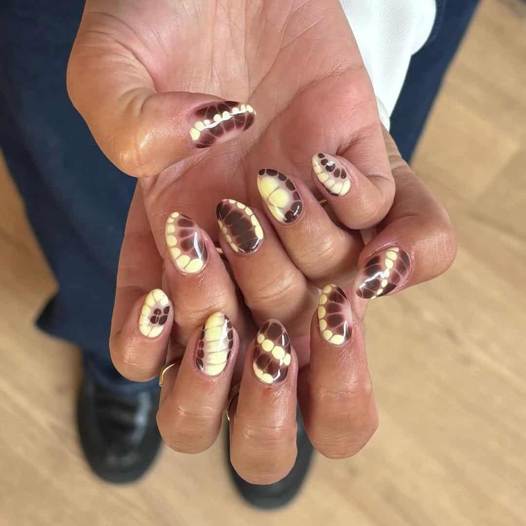 This standout design features rounded nails covered in a layered brown and yellow pattern, channeling vintage vibes with a modern twist.