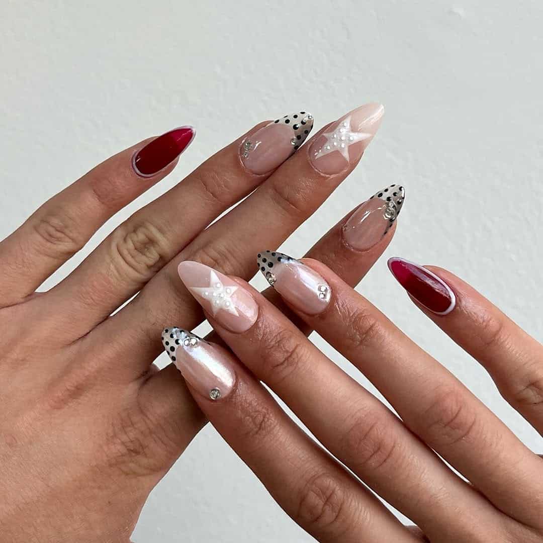 This almond shaped design combines sharp style with playful details, think bold polka dotted tips, glossy red accents, and dimensional pearl stars.
