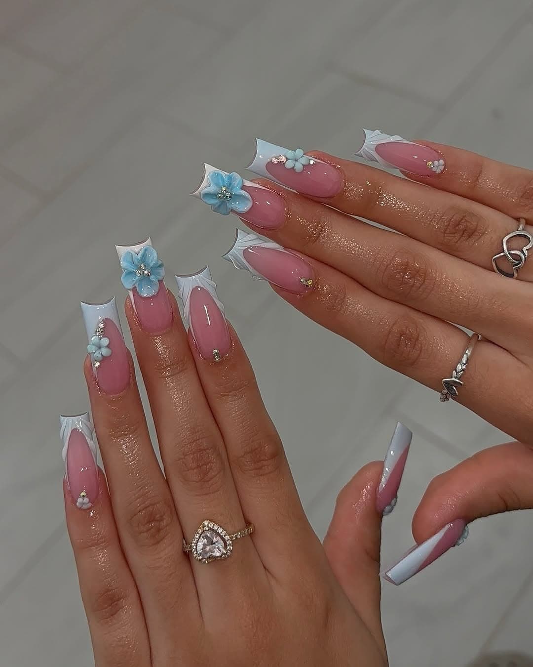 This eye-catching design features long coffin shaped nails with a soft pink base, icy blue French tips, and layered 3D floral accents.