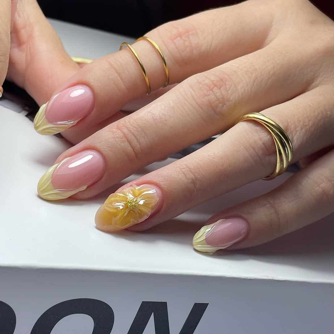 This clean almond shaped set mixes buttery yellow swirls and French tips with a standout 3D flower accent.