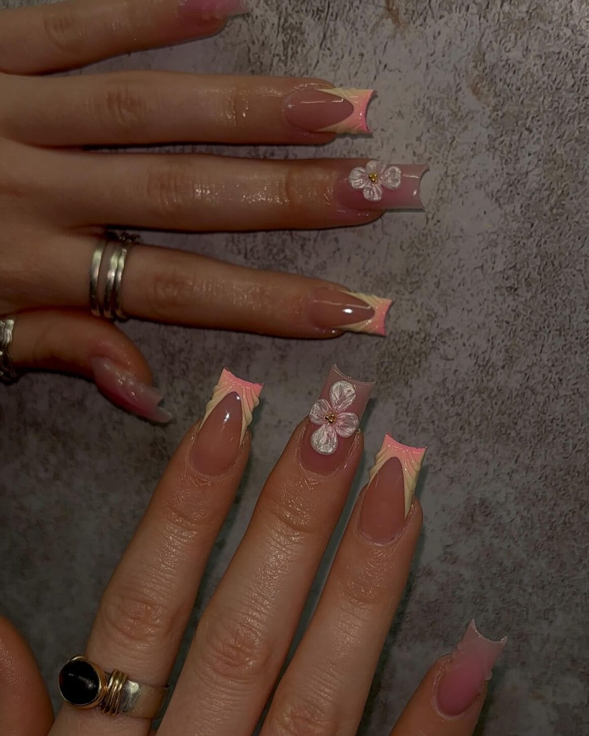 This playful square shaped set combines a warm ombré tip in pink and yellow with a standout 3D flower accent.