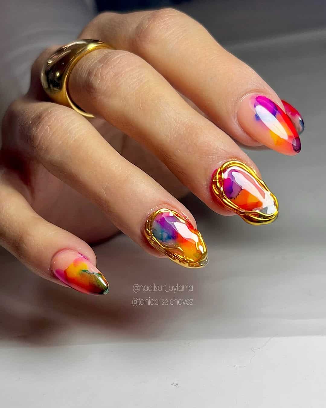 Think orange, purple, pink, and blue, with a glossy gold melt frame on select nails. It’s bold, artistic, and made to stand out in any lineup this May.