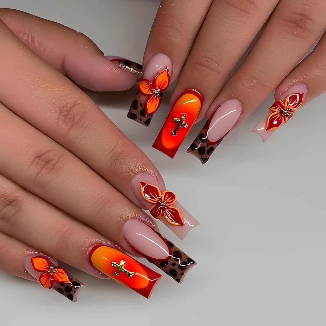 This long square set is bursting with bold energy. Featuring fiery orange ombré, shiny leopard accents, and sculpted flowers topped with gold cross charms.