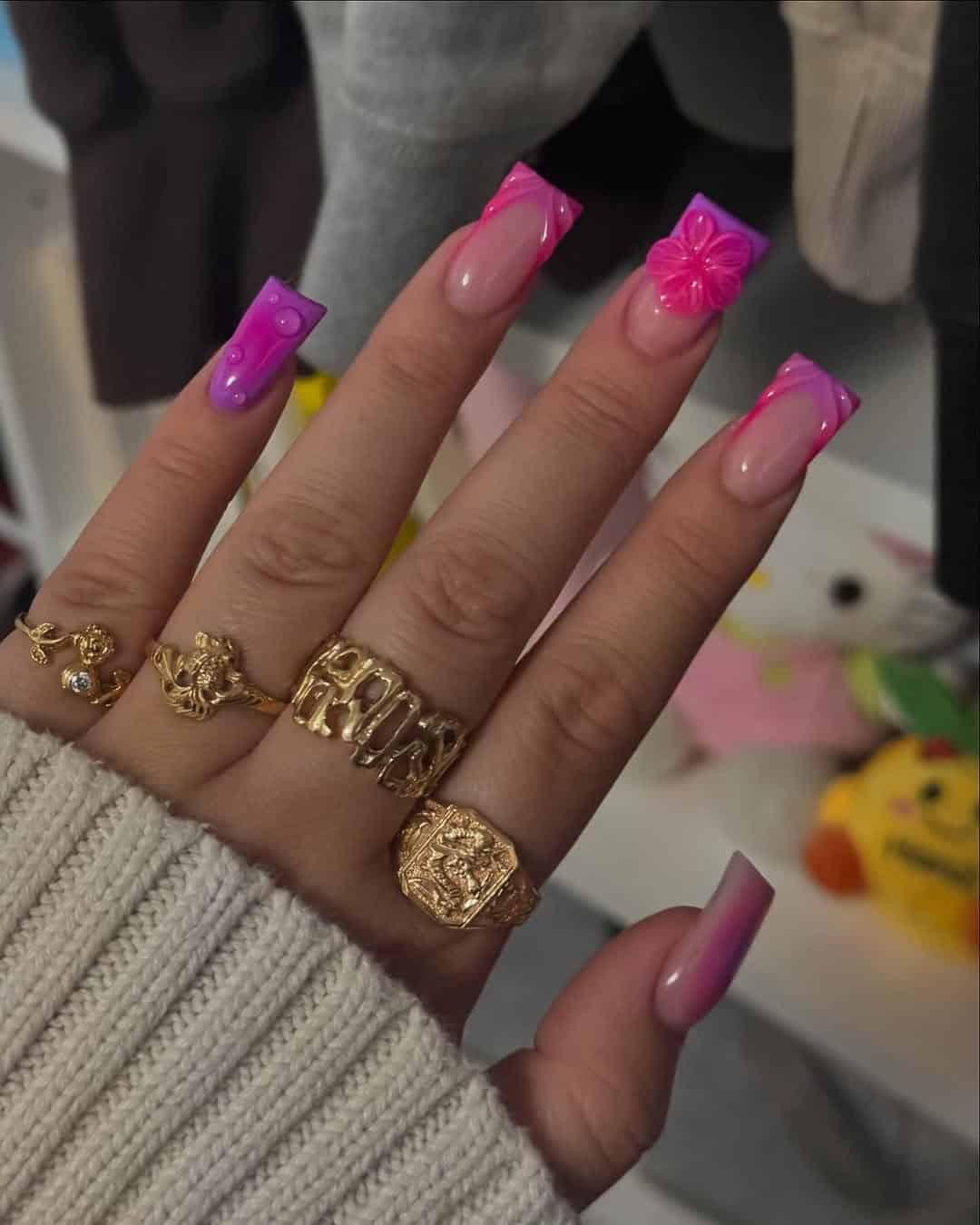 This punchy square shaped set mixes gradient bubblegum pink and purple French tips with sculpted flower accents and glossy embossed dots.