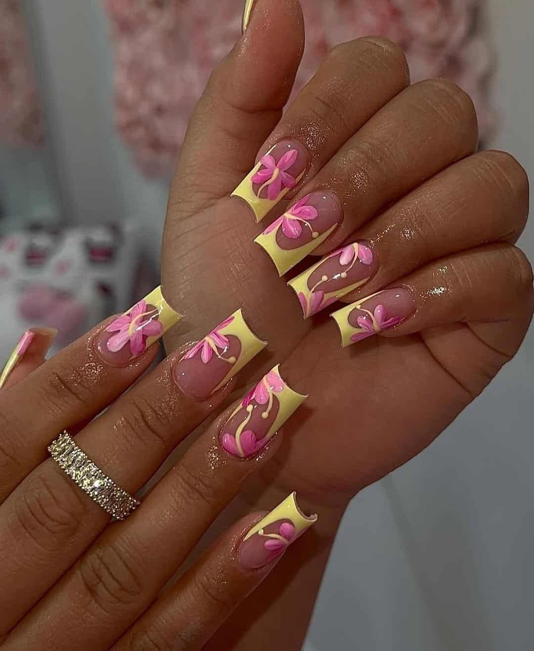This bold and cheerful square shaped design mixes bright yellow French tips with pink tropical flowers and glossy accents.