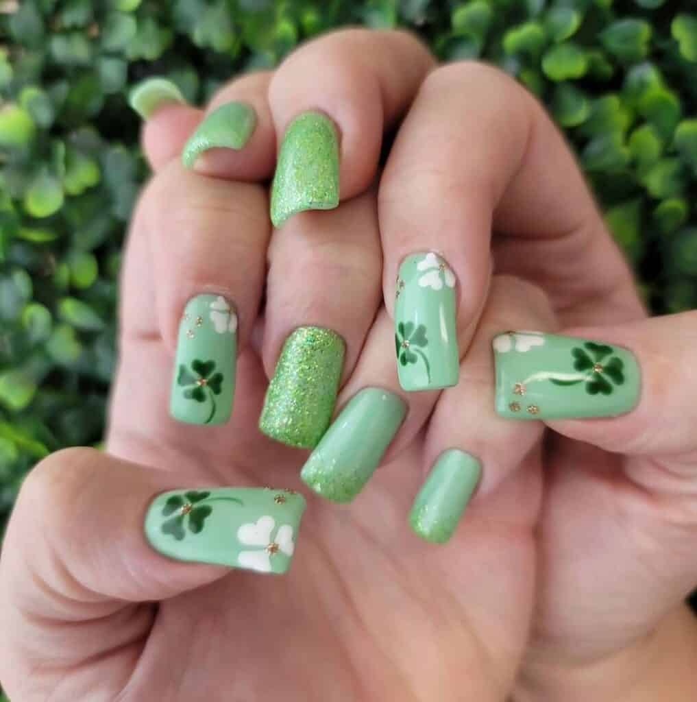 16 | Green Square Nails With Glitter, Green & White Shamrocks & Gold Accents
