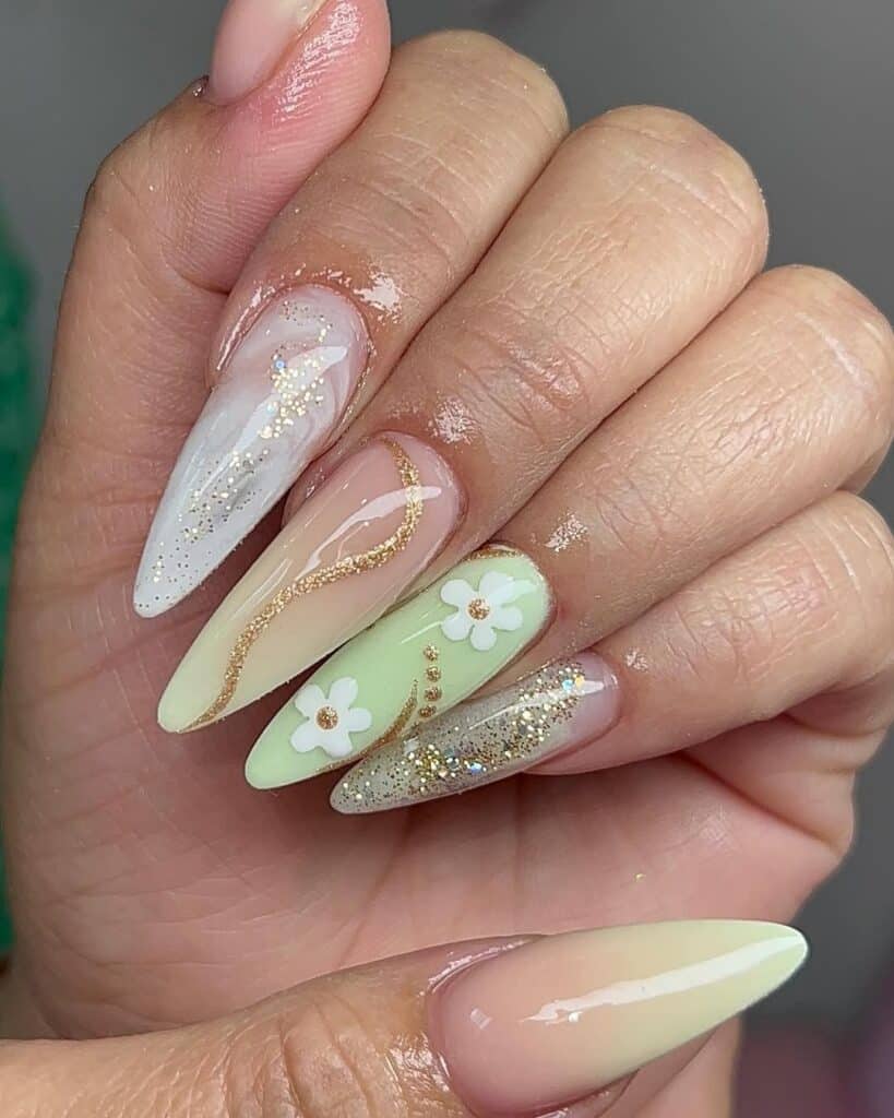 15 | White Solid Nails With Green & Gold Glitter Accents